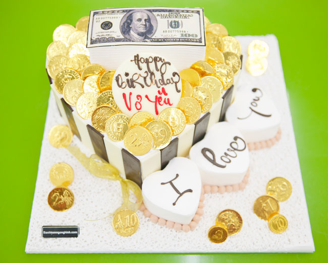 Bánh gato tạo hình 3d tiền đô và tiền vàng trái tim sang chảnh tặng vợ