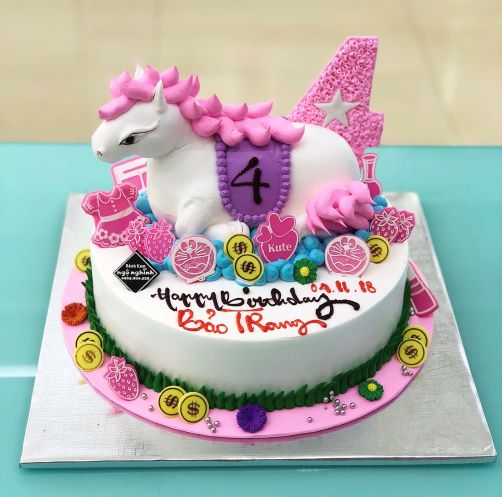 Bánh kem sinh nhật tạo hình 3d nổi con ngựa tuổi ngọ màu hồng gắn số 4 đẹp mắt