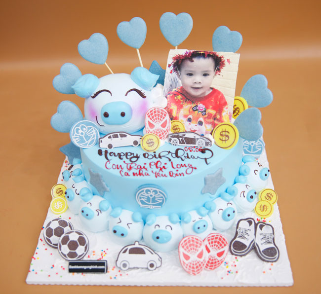 Bánh kem sinh nhật tạo hình chú heo tuổi hợi gắn ảnh đáng yêu tặng bé trai