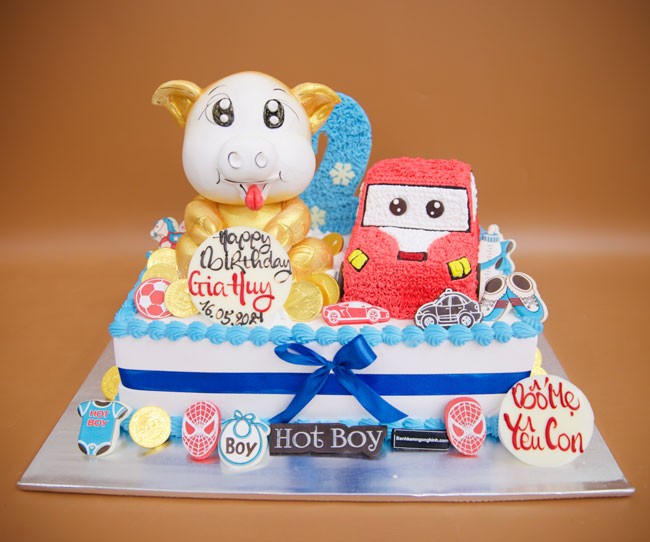 Bánh sinh nhật tạo hình 3d con heo vàng tuổi hợi và xe ô tô màu đỏ độc đáo