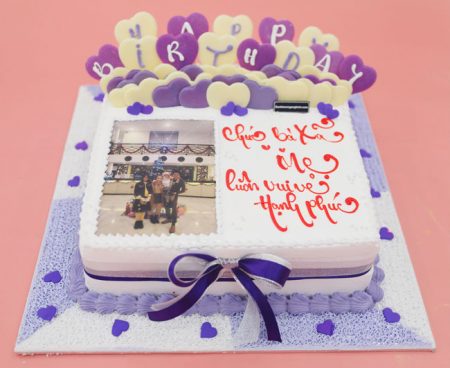 Bánh sinh nhật in hình ăn được gắn tim socola tím trắng đáng yêu tặng mẹ