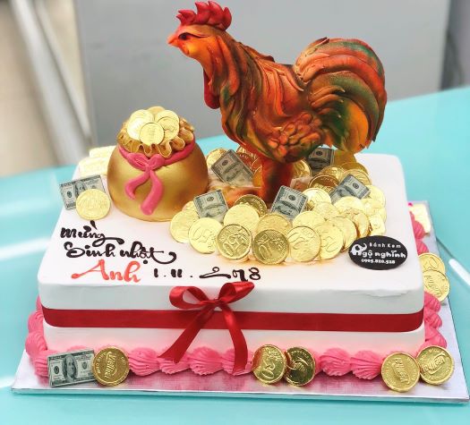 Bánh sinh nhật tạo hình 3d con gà tuổi dậu có hủ tiền vàng sang trọng tặng nam
