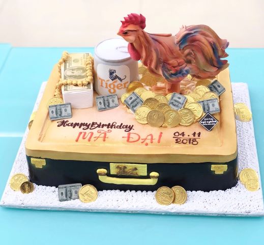 Bánh sinh nhật tạo hình 3d vali tiền vàng có con gà lon bia độc đáo tặng nam
