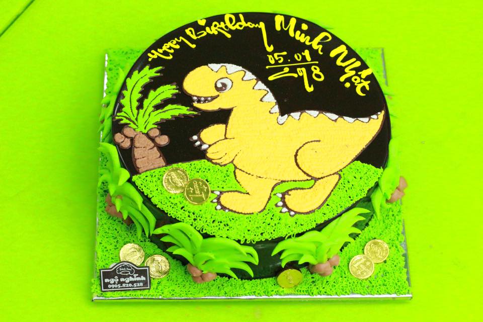 Bánh sinh nhật vẽ hình khủng long màu vàng phủ socola nguyên chất độc lạ tặng bé trai